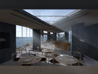 The modern open kitchen will be located on the old ship's wheel house. The bar, five different dining areas, the central atrium and the terrace giving guests a floating experience. The interior will be domestic and furnished in wood with natural decorations.