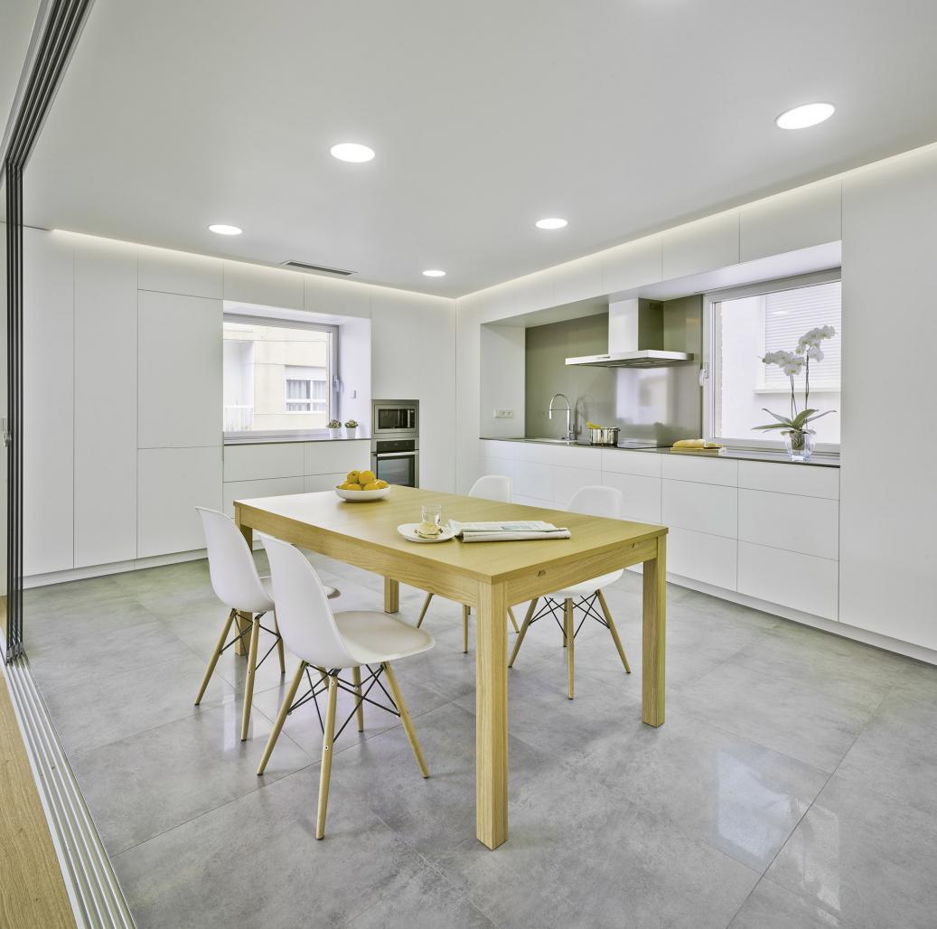 The starting point is the client’s wish to maximize the feeling of space. Beginning with an existing fragmented distribution, the objective is to connect and extend the rooms of the house. The quality of each square meter is its versatility, which allows for multiple uses of the space and, therefore, its apparent extension. On the first floor, the living room and the kitchen-dining room have been combined into one space, with the latter being provided with the possibility of being hermetically closed to prevent the smell of cooking spreading. This is achieved using a system of four sliding glass panels which in no way sacrifice the whole visual continuity of the set of rooms. The kitchen is no longer the marginalized place it had been in the previous home, but is now a high-tech area that has become a place for recreation and leisure.