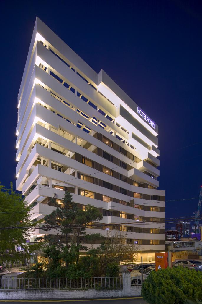 The difference between beach and river shore is wave. Visitors are expecting wave when they are coming to Haeundae. However, the site is not open to the sea and wave. That is the reason why the exterior of the building is a homage of wave. The uncertainty of the movement and the scattering white bubble of the wave are simplified into free white bands. Dynamic variation of the exterior reflects the continuity of wave, and pure white reflects colors, shadows, and lights. These metaphors therefore intensify the emotional effects that the hotel can bring to the neighborhood.