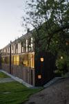 The divided volume allows all identical units with direct access to the backside. Formally it makes the volume appear lighter yet keeping a clear and cohesive façade expression. The clean and simple form has been kept thanks to great detailing of the untreated pinewood, applied with finger joints used both for façade and roof cladding. Windows in slender black steel frames aligns with the wooden clad façade, subtracted with niches for French balconies on the third floor that with its glass railing makes the volume appear intact as a solid. The integrated garage and main entrance door are almost hidden - treated with the same pinewood as in the rest of the façade and contributes to a distinct reading of the building.