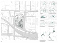 The project creates emergency shelters in the form of hexagonal galleries with funneled roofs that collect water for emergency use. These smaller units can be used in different combinations to house diverse groups of people during a disaster. In normal conditions the spaces contain art galleries with projected art during daytime and a Young – Adults shelter during night time. The walls also double as service spaces for the connection of electrical, plumbing and HVAC services.