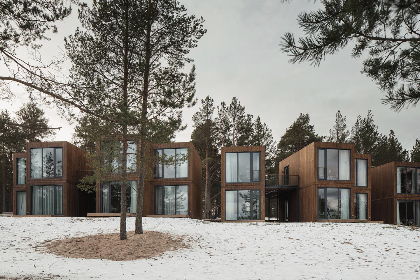The context of the northern nature of Karelia defined the architectural design: the hotel is situated at the point where the Vuoksi river runs into the Lake Ladoga. The first consequence of this context was to maximize the interaction between a resident and environment. It is expressed in a floor-to-ceiling glazing with a view of the Lake Ladoga from each room. The second is selected materials and patterns. An abundance of wood and dark metal in exterior finish shifts a focal point from architecture highlighting the nature as the protagonist in this space.
