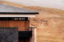 The first point in confronting the project is the amazing and very beautiful atmosphere of the site. The area is surrounded by a beautiful landscape of Damavand Mountain, valleys, river and vast pastures. Project's site is stretching along a relatively steep slope and from the point where access to lower stages is difficult and as the upper stage is the largest and the most accessible area, it was considered for the construction of the villa. Previously, the walls around the site and a metal pergola were built in the second stage that was retained throughout the design process. The most striking feature of the project is the presence of a beautiful and arrogant mountain Damavand in the northeast with a view of the Polour Village on its hillside. Considering the above background, the main idea behind the project was to answer how can one use this villa and simultaneously feel the presence and harmony in the pristine nature of this region? Or, in a simpler way, how can the inside and outside of the building be linked together? For this purpose, the images of glass frames and wide openings and space for dialogues with Damavand and nature surrounding the villa, was created in the mind of the design team. In this way, windows that frames Damavand Mountain is designed, the pyramid hip roof is formed as an element that can create a free surface in the ceiling (and yet also has a metaphor of Damavand's form), and under the pyramid hip roof, the stripped windows are created across the ceiling. These windows show somewhat suspended ceilings in elevations, and from inside, in all the rooms, there is a lane of beautiful sky of the region. According to the alignment between the outside and inside, vertical slabs designed that are visible in the facades. These slabs are drawn into the interior and make up parts of the kitchen walls, the living space, the fireplace, and so on. In the end, it should be noted that the architects' effort is to build a valuable and lasting building on this fantastic platform and we hope that our construction has not tarnished this unique nature.