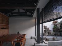 The owner rented a yard in the hutong and asked us to design a teahouse garden. It is hoped that the gardens will include the elements of traditional gardens and have the true feeling of traditional gardens. It is not allowed to change the plane position of the original building and hope to have a phoenix tree. The shortcomings of the base are similar courtyard structures, the courtyards that are seen at a glance, and the current state of the house being demolished. We used the folding wall and the moon door to change the internal space axis, and organized the new landscape order with small bridges, waterways and stacked mountains. We designed and directed the stack of red rock mountain. Several tea rooms with different views and feelings were made in less than 200 square meters.