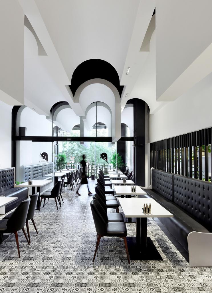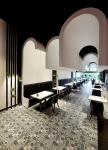 The project is located on Chizar Sq. in Tehran, Iran. Design started in 2010 and construction was completed in early 2011. It covers a surface of 300 sq. The initial position of the project aims to provide a unique Restaurant where knowledge sparks will be lighted through multidisciplinary communication. The concept of this design roots in the traditional form of Iranian architecture. Space is characterized by the use of traditional arch form, which visually defines the space organizing the functional program: an amazing Entrance, kitchen, dining areas, a virtual reality room, and coffee shop. In order to achieve a modern space alongside a symbol of Iranian architect for the users, two groups of semicircular arches are set in the main hall and they continued to the facade. These overhead arches aim to separate the whole large space into several delicate smaller zones which sound fields are more focused and clear. The mix of different natural and artificial materials (Traditional tile pattern, Black stone, black iron profiles, white gypsum wallboard) offers a combination of rough and smooth surfaces introducing a sense of spatial tension in the generally cozy and warm atmosphere. The furniture with different styles and placements can perfectly meet every single customized need. If necessary, this space can serve as a subordinate zone for the main hall. Light and shadow, white and black color are the best decorators for this space and that is why only the simplest materials are employed. As to the artificial illumination, we devoted to creating an elegant and peaceful atmosphere, reflecting the inner nature of the architectural space and fulfilling the daily using needs and can further shape the space or atmosphere the users need. The ultimate goal of the whole practice is to reach a perfect integration of architectural design and building technologies.