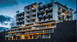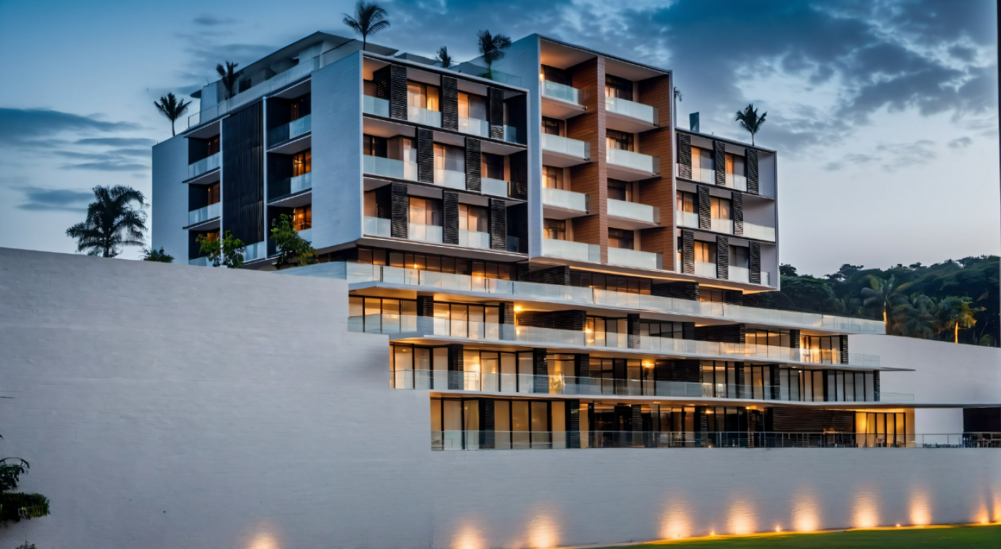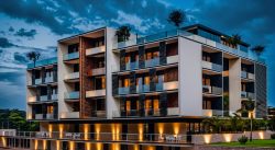 The project is located in Maputo, the capital city of Mozambique, an African country. Maputo is a port city in the Indian Ocean and its economy has developed around this port. The estimated population in 1997 was 966,837. There is a cliff-like slope in front of the land, and flats were designed on this steep slope by making 3 basement floors. These 3-storey basement flats have ocean views from all their rooms. The back of the flats is designed as a closed car park. After the ground floor on the upper street level, there are 3 floors and a penthouse in the building. The building has a design that gains centrality with respect to the adjacent masses, as the central mass forms a straight console. The building consists of 8 floors including basement floors. Project is designed with different kind of voids on each facade. There are 3 basement floors which has view to ocean. These basement floor's terraces have wood canopy for creating privacy. Street facade and facade of ocean have cantilever frames which emphasize main facades. The 1st, 2nd and 3rd floors have balconies. The penthouse located on the last floor enjoys the ocean view with a very large terrace area in front of it. The total construction area of the project is 9600 square meters. The ground floor is 808 square meters and the total residential area is 4200 square meters. There are 26 flats of different sizes in total. The indoor car park has a capacity of 36 vehicles. There is an open parking area for 12 vehicles at the street level.