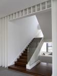 The calmness of the wooden staircase corresponds to the lightness and transparency of the glass handrail.