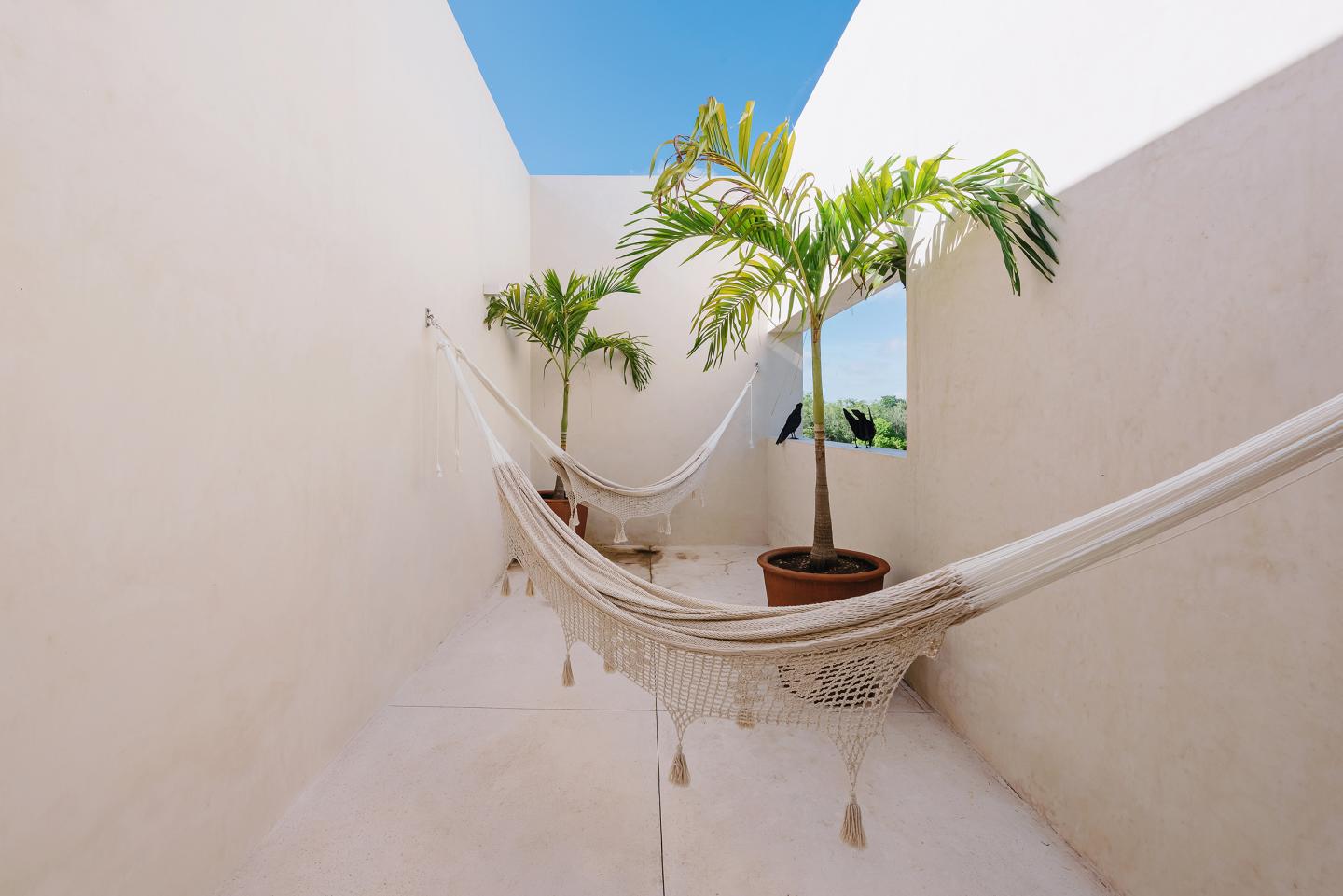 The materials are travertine marble floors in all interior spaces and porcelain in all exteriors. All the carpentry is made of tzalam wood treated both in doors and closets for greater durability.
