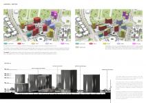 The built does not feel static at all but always dynamic and virtually moving from every side the users observe it. The whole urban experience is wrapped around the central magnets on both parts of the site. The change in levels around those two focal points creates a very different user experience of moving all around, thus provides quality open and built spaces. The open areas offer layered public spaces where people can visually interact with each other.