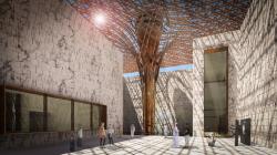 The complex geometry of the roof shading canopy contrasts with the simple forms of the museum. Glimpses of the wooden structure can be viewed from the exterior, but their full beauty can only be experienced from within the building. Its geometry is inspired by the complex motifs of Arabic architecture and by the ancient Emirati weaving traditions. The soft curvature of the funnels are made out of steam-bent wood, another Emirati tradition well known in the shipbuilding industry. Its purpose apart from creating a striking gesture is to shade the courtyards, cool down the atmosphere and refract the sunlight.  We have chosen wood as the material due to its low emissivity, its interweaving layers can be fully experienced from the rooftop promenade.