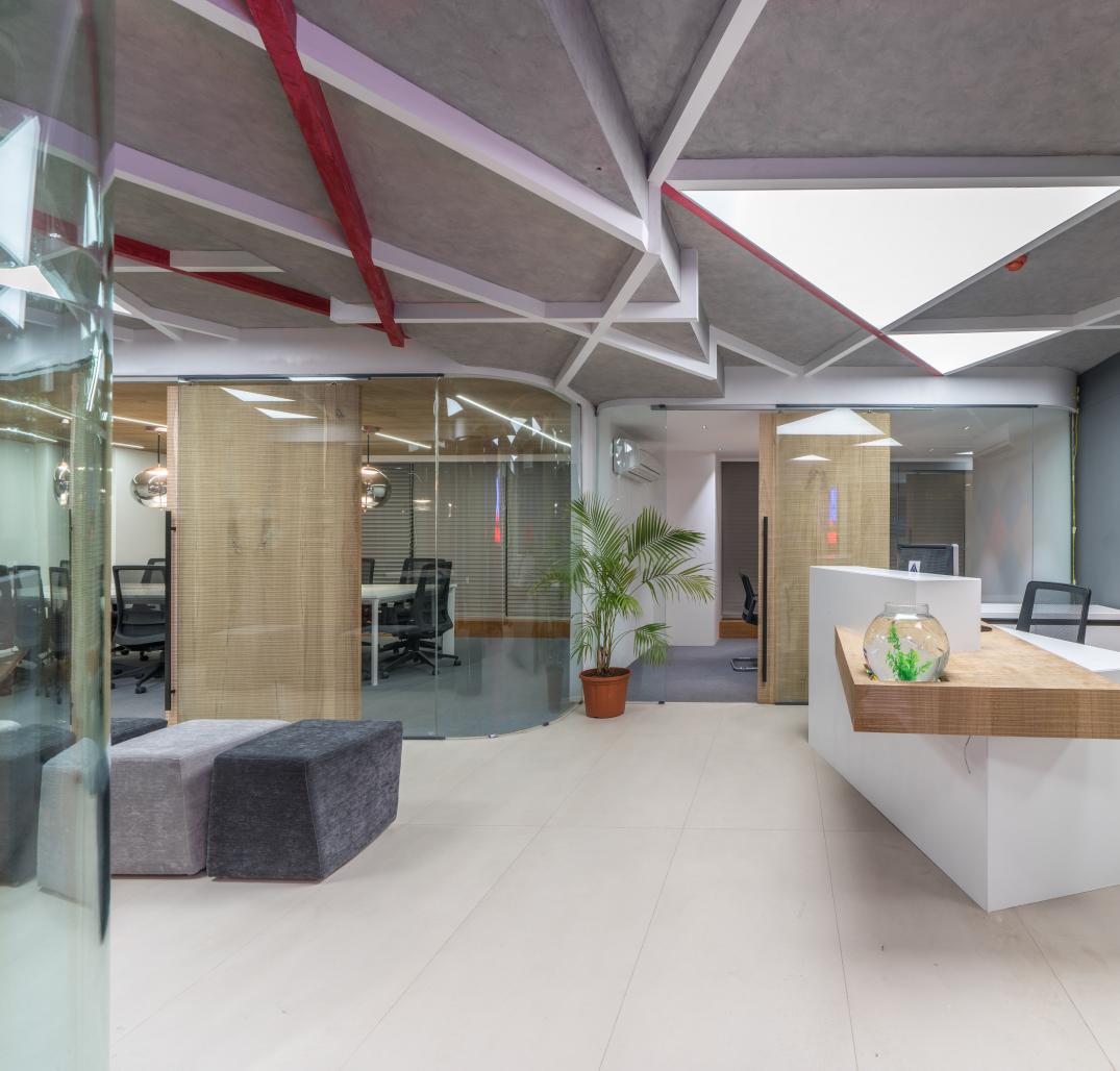 In a pursuit of bright & lively corporate working environment, the entrance zone has been kept white and minimal. Cabins are designed with concrete texture wall and simple desks to keep them symbolic so that these spaces are flexible according to the user. Having vivid panels inspired from the corporate color scheme in meeting pods helps to keep the space vibrant and acoustically insulated. Triangulated patterns came out as the primary inspiration for the ceiling design and feature walls while efficient lighting does the work of the final finish to initiate the diligence among the workforce.