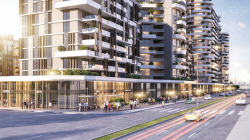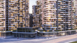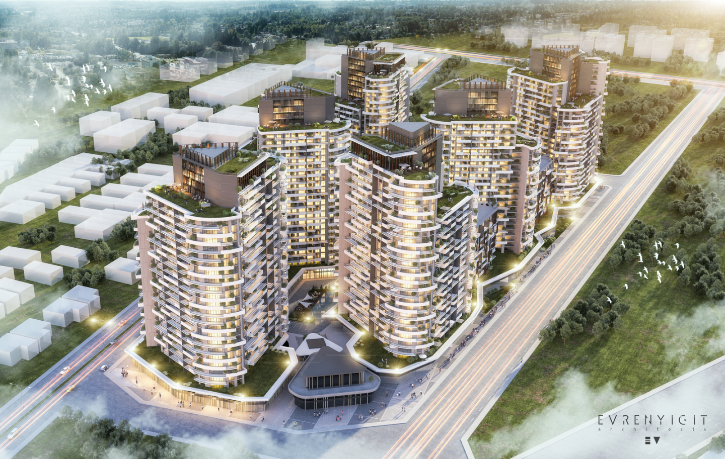 This project massively is very dense; due to the allowable area usage of the region. Due to that reason we create a floor height difference between the towers. In addition to that we connect all the towers form two side of the site; by this division two semi horizontal blocks are created and between them landscape is placed. Horizontality of these two-sided blocks abstractly decrease the heights of towers. Landscape and greenery between these masses created emptiness which is also helped that. For geometric projection of towers; curved corners are used and this form is also served for that aim. Distribution of solid and transparent elements of the façade is also support flow of movement. Ground floors of the blocks are planned as commercials whose facades are covered with the vertical elements for climatic concerns and coherency with overall design.