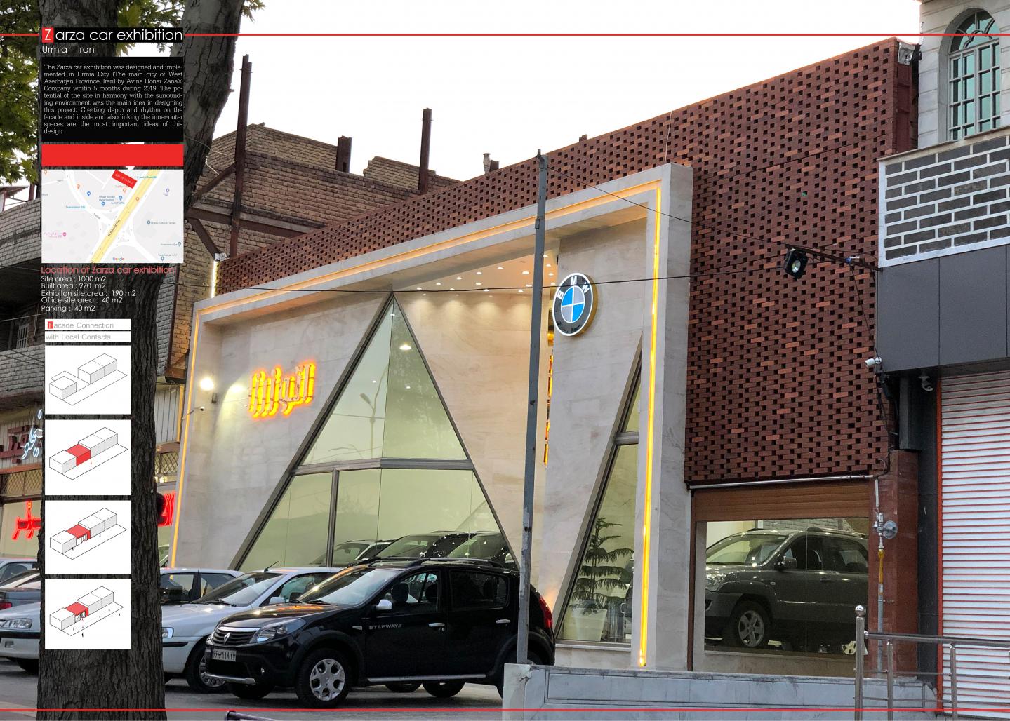 The Zarza car exhibition was designed and implemented in Urmia City (The main city of West Azerbaijan Province, Iran) by Avina Honar Zana® Company whitin 5 months during 2019. The potential of the site in harmony with the surrounding environment was the main idea in designing this project. Creating depth and rhythm on the facade and inside and also linking the inner-outer spaces are the most important ideas of this design