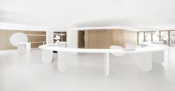 The interesting office tables are made of ultrathin steel plate and supported by semi-circular pier, naturally forms a small area of different working attributes, and each connecting area is the stage for thinking collision.