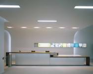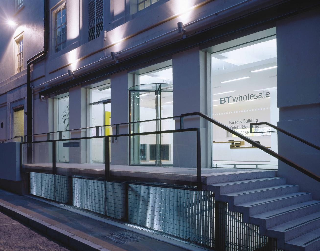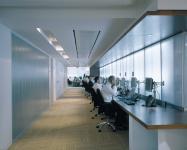 AVCI ARCHITECTS’s design for telecom giant BT Wholesale’s central offices in London transformed a former telephone exchange building into a model of the modern, open workplace. In addition to programming an open floorplan, the project added a new reception level, executive office floors, and a rooftop restaurant. The use of sub-industrial materials, such as backlit polycarbonate and cast glass panels, set against such rich traditional materials as walnut, adds a touch of industrial chic while maintaining a sense of corporate quality.