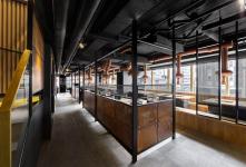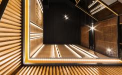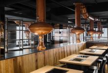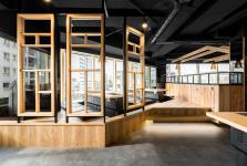 In consideration of the limited height of the space, designers made wooden platforms to represent the traditional Korean BBQ shop seats design (horigotatsu).