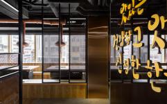 Starting from the thought of innovating of tradition, designers tried in every aspect to combine new style with old elements. Designers made traditional Korean BBQ shop into modern loft lounge bar style, by using the contrast of light and dark tone wood colors, the space looks simple but not colorless. The partitions between seats were made by rusted iron board and tight chain link board, which not only maintained the visual penetrating, but also kept the privacy of customers. With gentle golden Korean words design as the wall decoration, the space looks youthful and interesting, and shows the fashionable simple style of K-food.