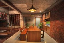 There is a dynamic play of light and volumes when one enters the house - the Jali works, the louvered gable and the skylight helps achieve this. The skylight, create an ever-changing pattern of light throughout the day which gives the inmates, an unique experience there at different times of the day. The house is an exploration in transitionally revealing the beauty of ‘burnt earth’ in the form of one of the oldest and most versatile man-made construction materials – the ubiquitous BRICK. The design and ensuing construction process was a purposeful journey of allowing exposed brick utilising a uniquely customised bond layout pattern, together with exposed concrete ceilings, polished concrete floors to lend rich texture, form and warmth to the tectonic ensemble.