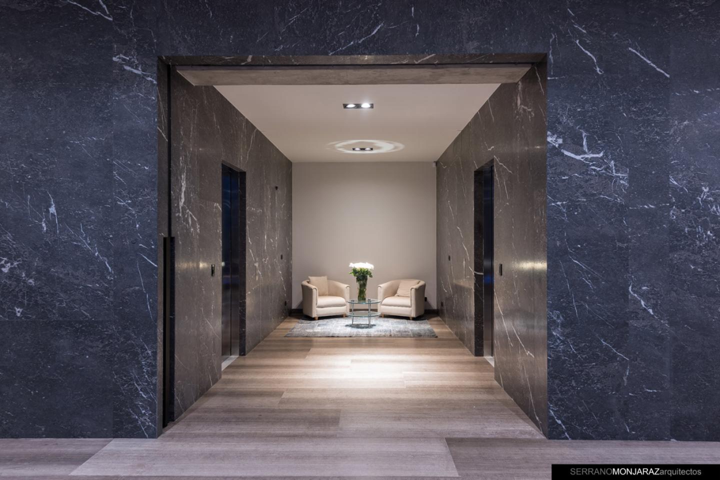 This space divides the project into 2 different areas: public and private. Both converge into an impressive entrance hall covered with kassama marble plates that frame the elevators. A simple system of partitions divides this first module between the penthouse and a small office. Natural light comes from the central garden and from a large terrace.