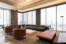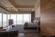 The communication corridors are free of ornament allowing accommodating a single sculptural element: two wings carved in resin frame the allegory of an emotional effect. This element leads to the social area of the family, the family room, which functions as an informal semi-private where gray wooden marble and fiber cement panels are used to enunciate a monochromatic space composed in grayscale and walnut accents. The living and dining room, subtly divided by a multifunctional element, are resolved with panoramic views that, together with the furniture and finishes, achieve a progression of gray tones creating a sober and elegant ambiance.