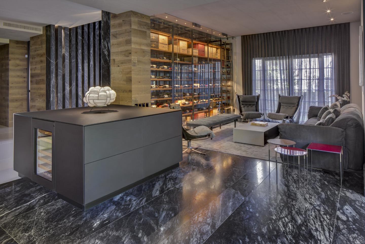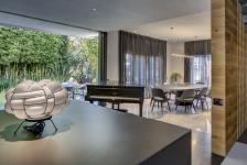 The double height access hall was framed by Deep Grey marble cartouches that stand out because of the indirect lighting they have, furthermore they contrast with the White Crystal marble floor giving access to the staircase and interconnection corridor, where the studio may be seen. In the right end of this central axis there is a small hall covered with timber that hides the toilet´s door, as well as the guests closet and storage. Within the circuit of this floor there is also the family room, a social area that was thought for large gatherings and its main goal is to extent the interior of the house towards the garden where the dining room is located and the living room has splendid natural light that was carefully sieved by the selected gray curtains.