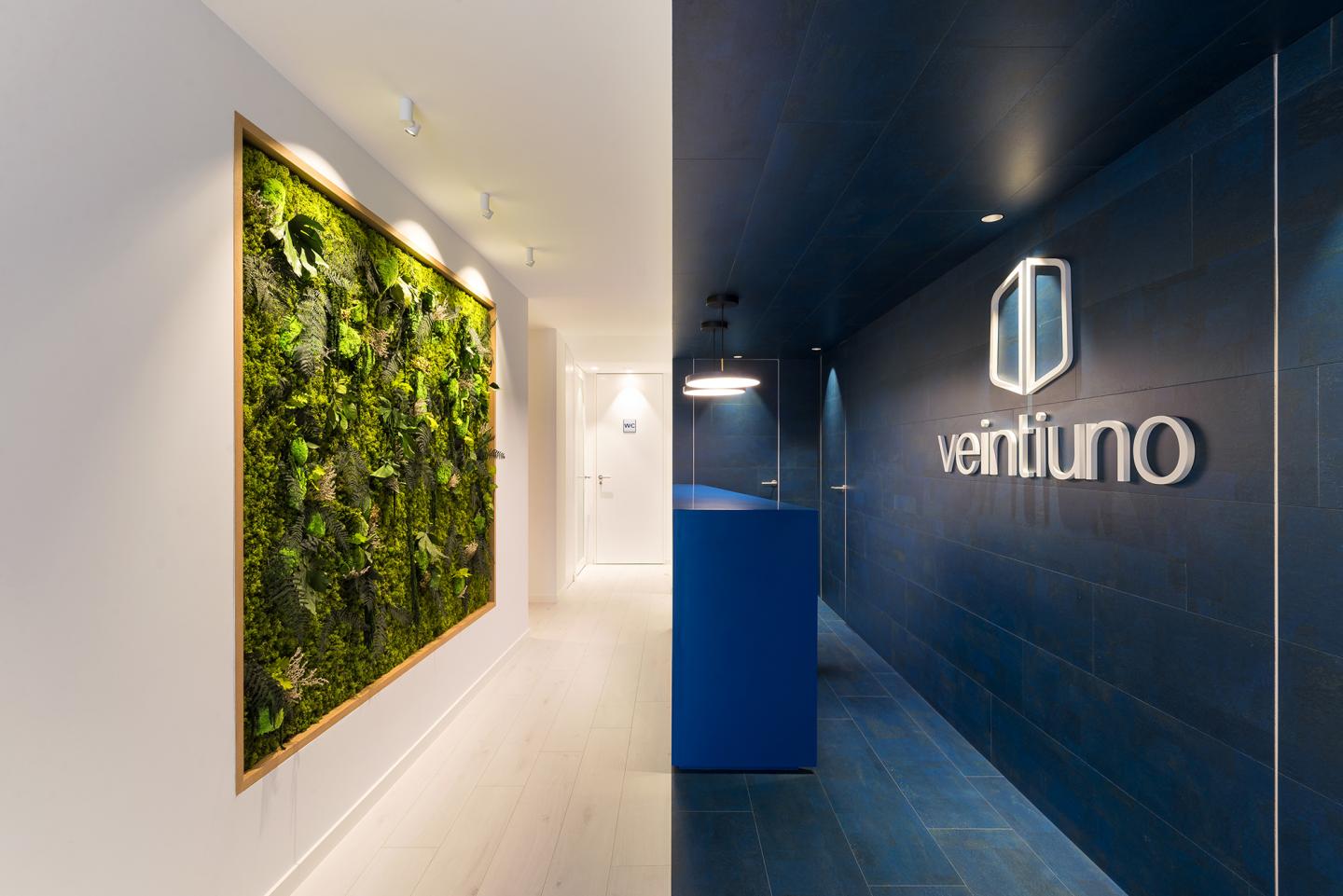 On entering Gabinete Veintiuno, the visitor will be impressed at first sight in the reception area by a double space which reflects, in the same way as the two hemispheres of the brain, the intention to combine a clear, ordered environment with a more artistic and colourful environment. One part is faced in its entirety with natural cork in blue tones, thus evoking creativity and imagination. In contrast, and in the same way as occurs in our brain, there is another part of the reception that alludes to calmness and reasoning, using materials which are more neutral and minimalist in whites and light colours.