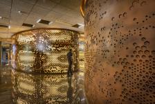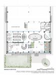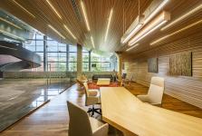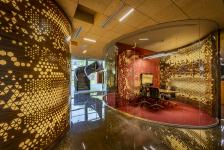 Volumes within volumes lend each functional part of the office their own identity. A large reception space is punctuated by a 36’ high seating area in the form of elliptical pods floating in a shallow reflecting pool at one end and a landscaped courtyard at the other end.