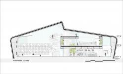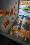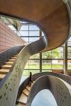 Towards one side, a 36’ high multifunctional space with movable modular platforms is designed to be used as a furniture display space, a seminar hall or a social interaction space. A cantilevered sweeping stairway spirals asymmetrically through this volume connecting the 3 levels of the office.
