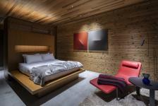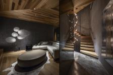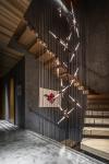 The ground story mostly constitutes grey textured paint on the walls and grey stone floor tiles to enhance the feeling of being near the earth. The second story is finished with gloss-coated concrete flooring and timber walls and ceiling to mimic the atmosphere of a forest. In the third story, wood surfaces dominate, positioned in an outward direction to draw the eye out toward nature and sky.