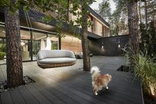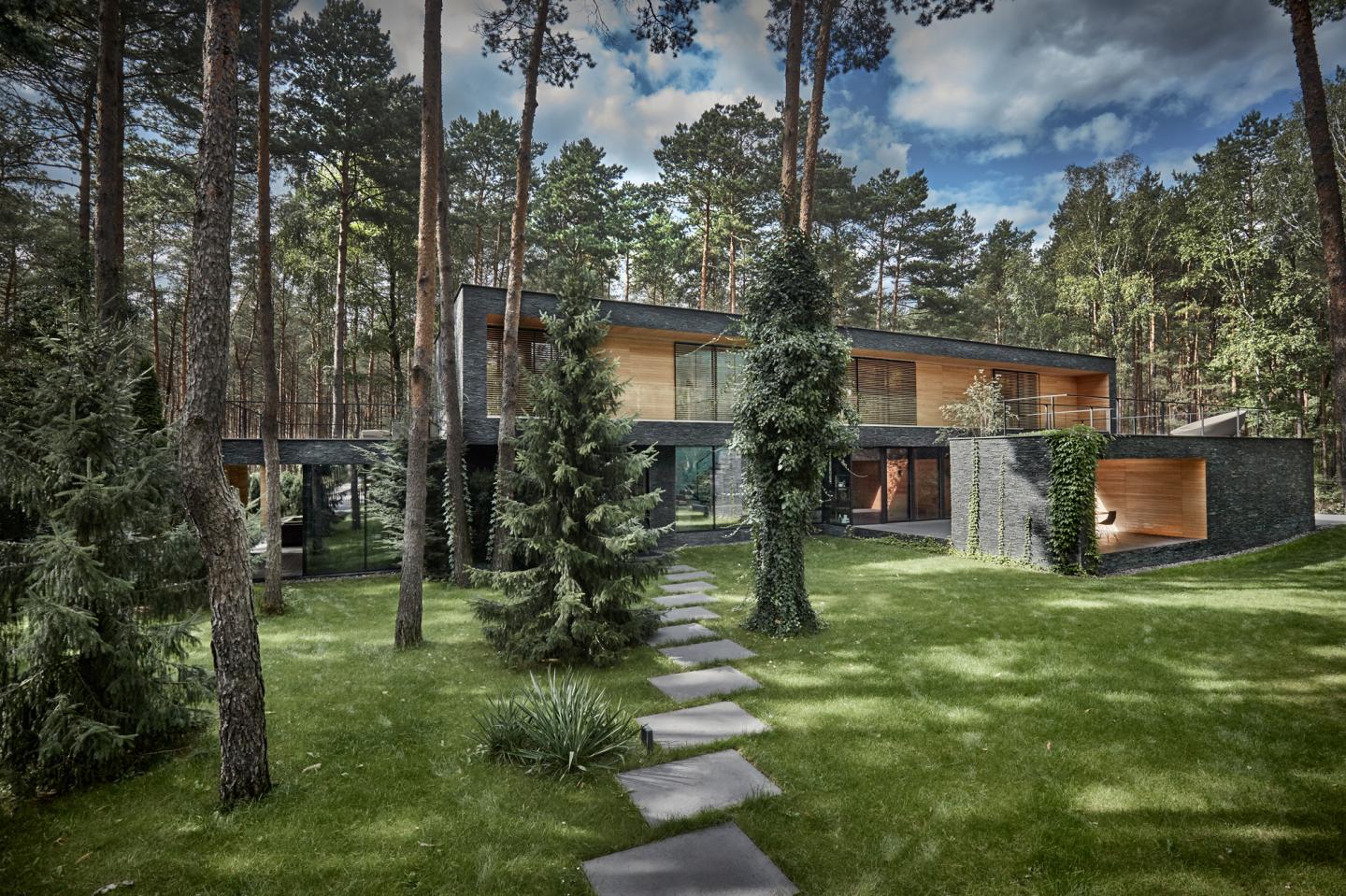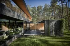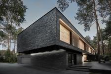 The greatest value of a house in the forest is the opportunity not to disturb natural surrounding. In this case we try to hide building by using black slate on elevation. This material is the very similar to dark color of bark of pine tree.
