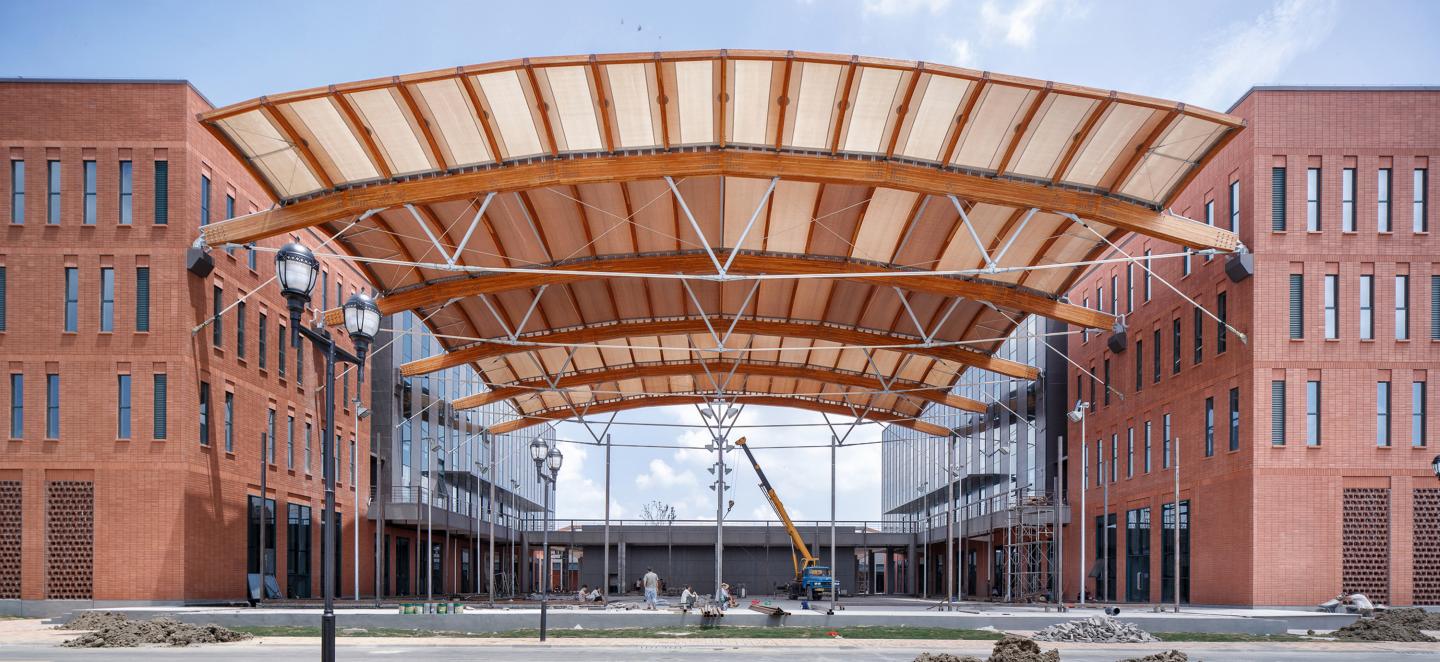 The semi-outdoor tennis court is designed to supplement the shortcomings of the outdoor tennis courts that cannot be used on rainy days. The upper covered steel-wood membrane structure spans 45.6 meters and is a multi-frame and two-way arch structure. The structure is light and original, and the architectural form is novel and beautiful. Among them, the large-span steel-wood structure is designed to combine of strength and beauty of sports architectures, while drainage measures and edge-receiving nodes of the membrane and the arched steel-wood structure reflects high degree of cooperation and coordination among architects, structure specialists, membrane structure manufacturers and on-site construction personnel. They completed the relevant node design without revealing the traces and presented the design pursuit of fulfilling architectural beauty through structure.