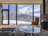 The house is located near the development’s entrance. A distinct form of two rectangular blocks sliding in opposing directions in accordance with the terrain presents a lively introduction to the site. Porosity is enhanced, as other property owners driving into the estate are accorded views of Mt. Yotei though the parti’s resulting voids.