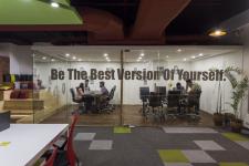 Glass has been used for most of the partitions, allowing an easy visual access to the meeting/ conference room, which is further designed as a versatile space which morphs into a games room. The specially designed conference table, doubles up as a Table Tennis unit as per the demand of the time, space and situation. Further, the conference room can be segregated into two smaller meeting rooms via sliding folding doors.