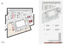 The 2 storeys horizontal volume contains the main functions for the community, such as stores, little shops, bars, restaurants and a sport field for a 2500 people audience; the indoor paths permit direct connections between all the public spaces around the sport palace.
