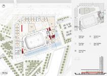 The underground floors include services for the sport field, such as gyms, infirmary, storage spaces, and both private and public parkings.
