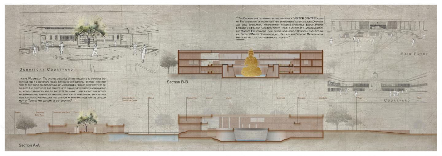 The Doorway was determined by the design of a “VISITOR CENTER” based on The connection of people with new environmenr/society/culture,Openness and well circulation,Transportation facilities,Informative Display,Proper Learning and Reading Facilities,Proper Health Facilities,Well Accommodation for Visitors Refreshment,Local people development,Research Facilities,Local Product/Market Development,well Security and Providing Maximum information to the local and international tourists.