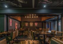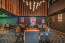 Further on, as the design meanders into the mezzanine and terrace floors, one stumbles upon the accentuated colorful mosaic pattern placed across the walls as you journey upwards. Added to break the monotony of the dark themed décor, it portrays an essence of illusion when an individual moves between levels. The feeling of vitality has been subtly expressed through the inculcation of wooden massing and green wall installations, adding a more defined character to the connecting corridors.