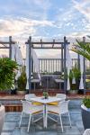 Bestowing a lush, fresh and vibrant vibe to the ambiance, is the pensively designed terrace. Its lucid and moderate persona is assimilated through serene furniture and minimalistic use of material, rooting an unconstrained and breezy spirit to the atmosphere. Juxtaposition of yellow, grey and white in the flooring formulate a distinguished spirit. Display of protruding horse sculptures in red & blue, having plates etched with colorful graphics grant the walls with an unconventional demeanor. The terrace bar, serving as the focal facet boasts of colorful graphical posters below the counter, supplementing the existing essence of vitality. Plants are hung from pendant lights with an aim of infusing connectivity between the built environment, the users and the natural environ circumscribed.