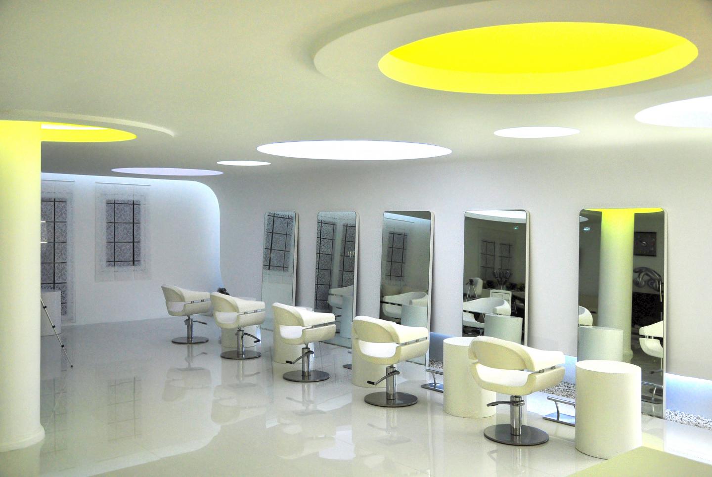 Using the rectangular design of the back of the canter (a metaphor of the movement and twisting of the hair, consisting of several arcs with a definite and definite end) and the existence of three cylindrical planes in the plan, the decorative cavities of the cylindrical cavity with the provision of light make-up, disruptive Towel holders, white cylindrical tables, as part of the hall furniture, and mirrors with rounded corners. The use of white color allows the color of the light to be converted to light by shining colored lights. That is, the coloration of this hall is done by light. To do this, a path was adopted for the use of colored light (yellow lime). This colorful path starts from the cavity above the column of the makeup salon, and after the accumulation of yellow light in several overlapping circles and repeating it in the plot of the furrow behind the counter, under the arched wall leading to the bridal chamber. In fact, parts of the hall used for circulating and crossing are marked in yellow.