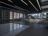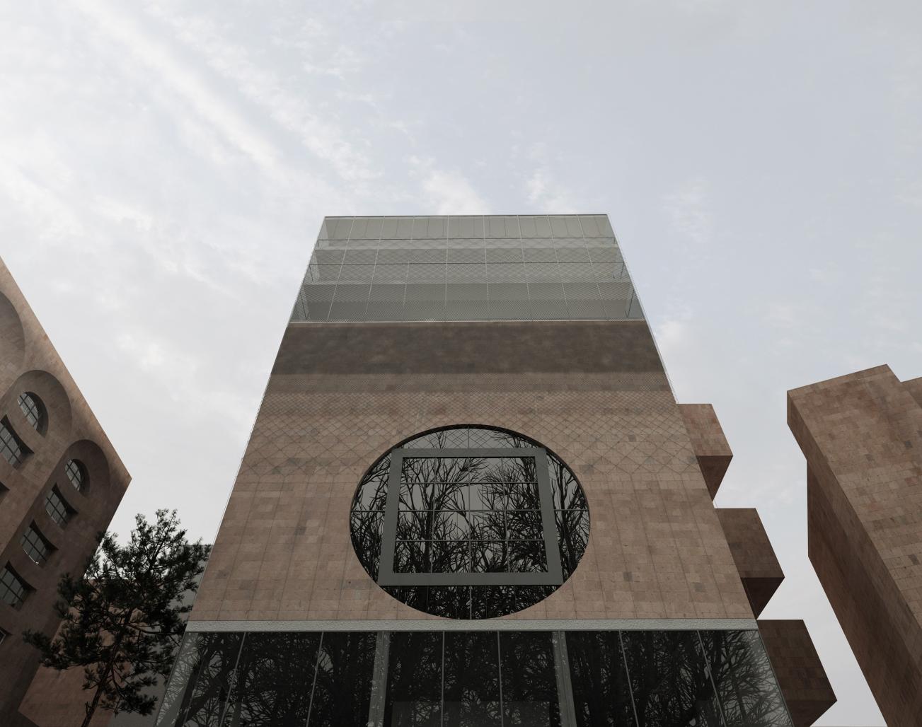 REVIVING NPAK, we tried to look beyond a single building among urban texture. By reviving the city context, we will be able to revive this multi-functional cultural center. So we decided to remove the ground and first floor walls and clear the area to achieve a public space that connects the Vernissage to the old town of Firdusi creating a plaza for people. This is also a great financial achievement due to attracting the public. We tried to minimize the changes in the main building structure and just by adding three and a half floors, we responded to the functional requirements. (Columns will be reinforced due to seismic fortification). This add-on was done in a way to be separated from the old building and we embroidered the old and new structure by putting a metal net pattern on it. This metal pattern is also a seismic approach to fortify facade stone tiles. Making it divided, but also connected. To achieve maximum performance, our idea for most of the spaces was a changeable, free plan. The adjoined structures to the old building was removed for a better spacial quality in ground public space, replaced with a vertical shaft to connect different scattered spaces with bridges. The width of these bridges was responsive enough for administrative space, emerging a special and creative ambient atmosphere.