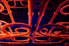The base of the installation is an independent platform covered with six centimeter diameter holes, which host the balls. In the space above the platform are two sixty meter long, brightly coloured metal tracks in the form of half round pipes which are hung from the ceiling and constructed in an intertwining manner. This rather complex looking structure of the tracks, after precise calculations, has been optimized to be built upon different