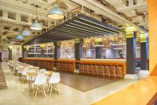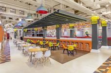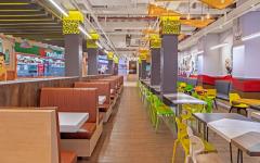 The key differentiating features of the food court includes -Customized 55 Feet Wall Art themed on our love for Bollywood showcasing tug of war for food between Bollywood heroes and villains. Customized lights based on Bollywood Movie themes and hanging sculptures at the entry are other intriguing design elements added to decor of the building.