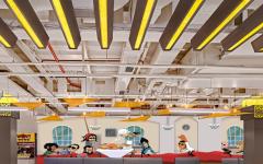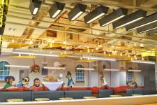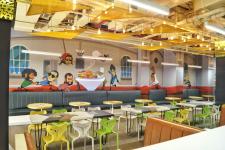 A 55 feet wall art was specially designed to portray the main essence of the space. It showcases a tug of war over food between the famous Bollywood heroes and villains.