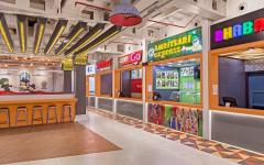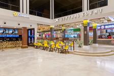We also employed 5 different kinds of flooring options in the space however, the highlight are the 2500 triangular pieces (with 3 different colours) designed to accentuate the area bordering the kiosks of the food joints.