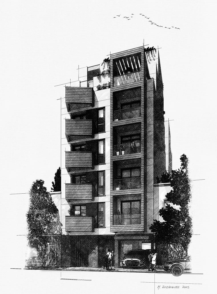 • Materials: The core of the building will be constructed with RETAK (thermal bricks), a concrete structure, and white plaster finishing. Wooden balconies have been incorporated in two different shapes “inclined isolated” and “combined porches”, and black aluminum carpentry, all of it creates a clean and tensioned stepped silhouette.