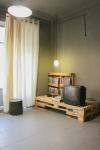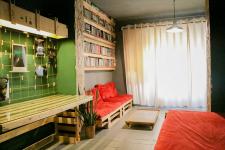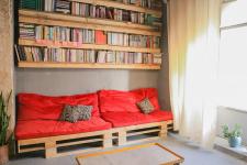 To reduce the cost of this project, the materials are all recycled and they are used either directly or with some adjustments. The team tried to minimize the costs of the project by using Wooden and Corian pallets were as cheap materials which were easily accessible and adjustable into bookstore, sofa and TV table. Cheap wooden boxes were also used to create a closet and lightbox; to elevate the bed we used a shovel's handle. Disposable wooden pallets were a good choice to cover the extra unusable door in the room and very simple tools were used for interior lighting.