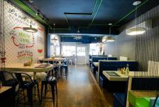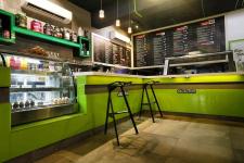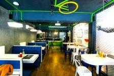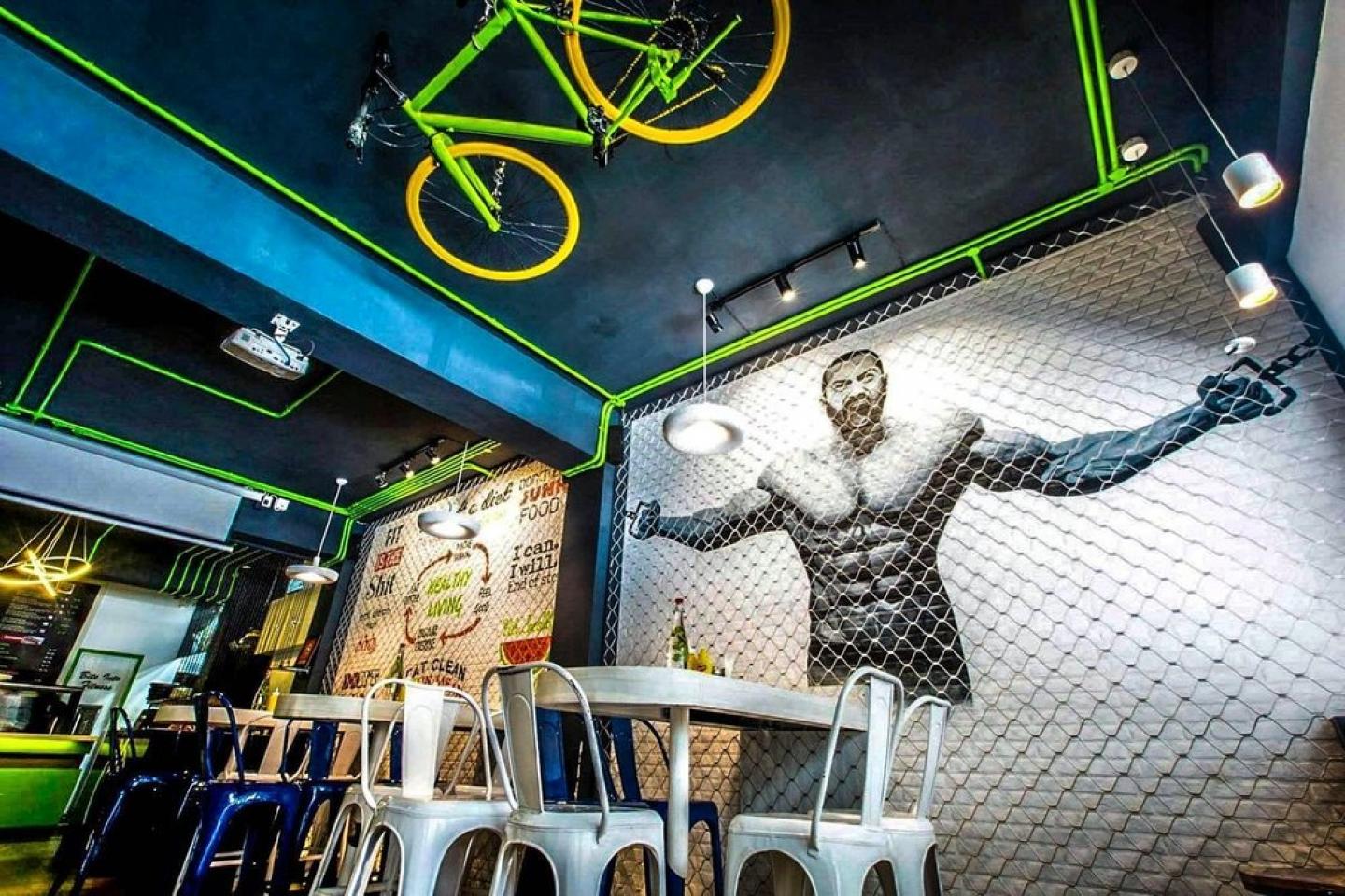 Gymskook, as the name suggests, is an all out fitness café. It’s the ‘go-to’ for all the gym freaks. Everything from the colour scheme, furniture, wall treatment and installation aims at creating a space infused with high energy, vigour and vibrancy. The exposed ceiling of the cafe has been intended with a fluorescent green-yellow bicycle installation surrounded with pulsating neon green PVC pipes, running throughout, on a backdrop a dramatic yet solid charcoal grey. Concrete-textured raw walls, robust and sturdy aluminium mesh wall treatment, metal chains and Tolix chairs, together give the space a strong-featured appearance. In order to balance out the tough and hardy mood of the café, the walls are painted with inspirational quotes and dynamic graffiti. Hence, exuding a sense of dynamism and enthusiasm. Another eye-catching feature that elates the café is the use of Cantilevered tables that exhibits the concept of working "AGAINST THE GRAVITY".