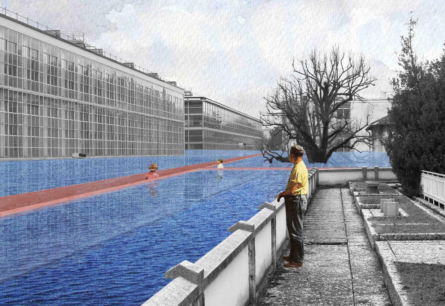 To this, we declare the flooding of the Olivetti site by directing water from the Dora Bàltea River adjacent to it. The flood will come as a welcome stream of vitality, filling the void between the buildings as it rises to a level of 10m. Here, the water will create a Fata Morgana of the once utopian landscape. The iconic heritage buildings will now exist as an archipelago of monuments within the lake, isolated and protected from any outside influence.