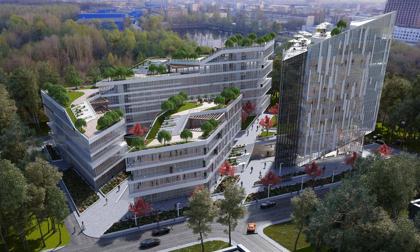 On the ground level at the perimeter of the building are the entrances to the buildings and public places: shops, cafes, gym. In the internal circuit of the buildings courtyard – public and recreational space for employees and guestsб raised to the second level. This gives the opportunity inside on the ground level to provide loading and maintenance of each section of the building, unnoticed to all. There is also parking for 60 cars.