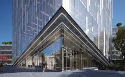 There are research laboratories and office space at the highest levels (2-11) in all sections, except the smallest. All of them have a panoramic view of the city and the neighboring park with a lake.